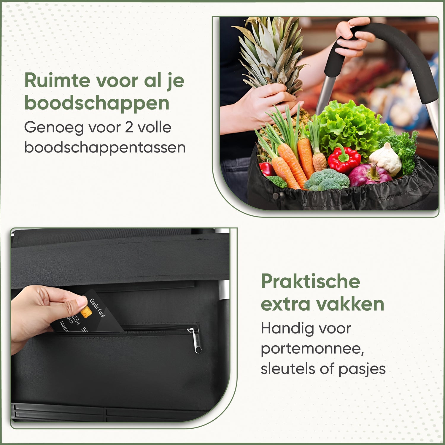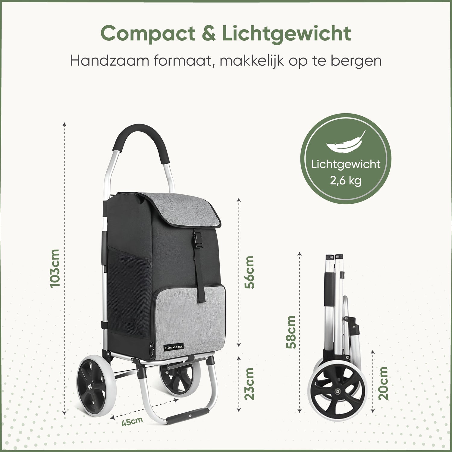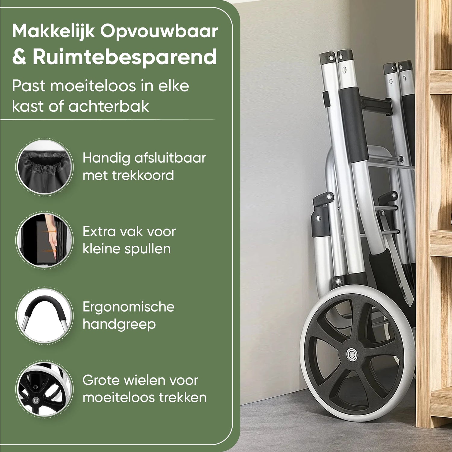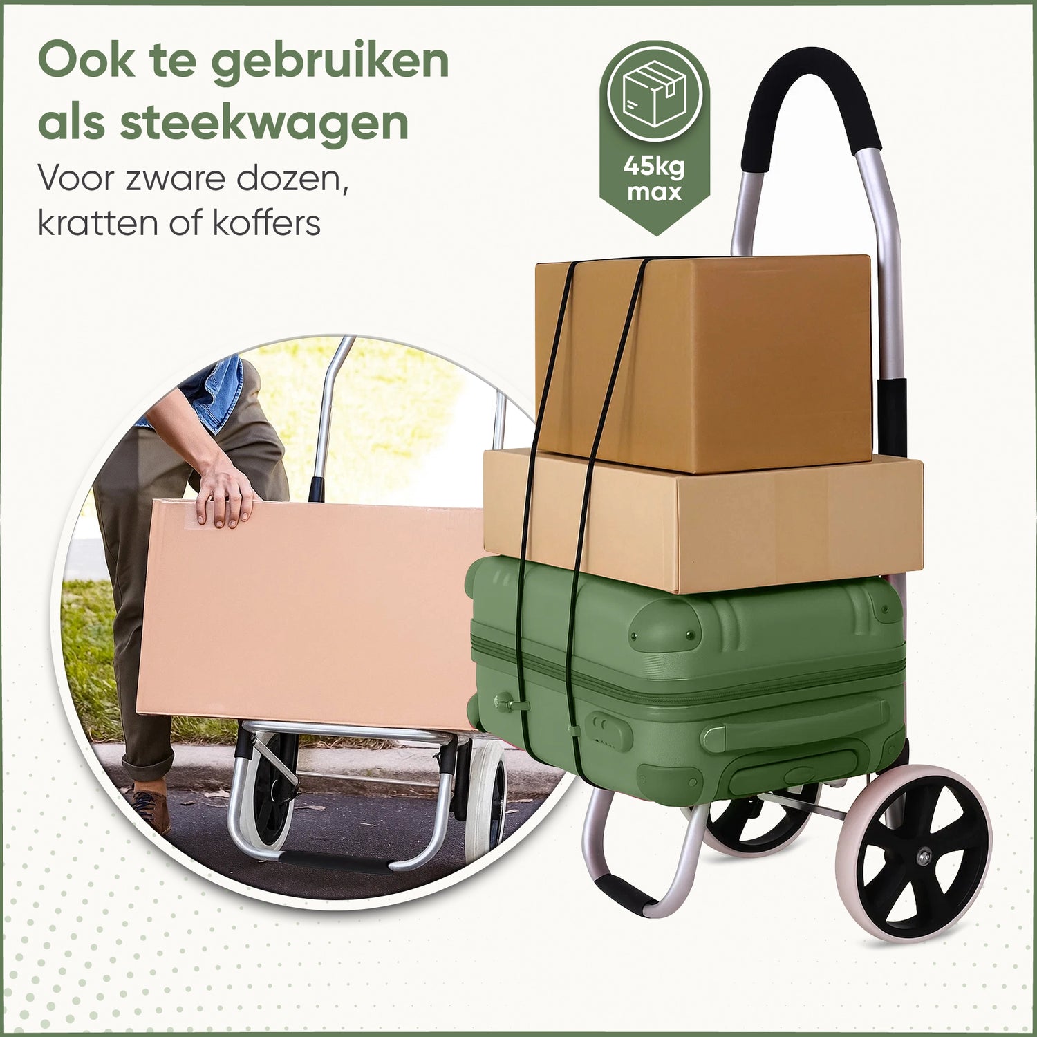 Dankzij het lichte, inklapbare ontwerp neem je hem eenvoudig mee en berg je hem compact op. Met slimme extra’s zoals een koelvak, ruime opbergvakken en een draagkracht tot 45 kg is hij perfect voor dagelijkse boodschappen, dozen of bagage.